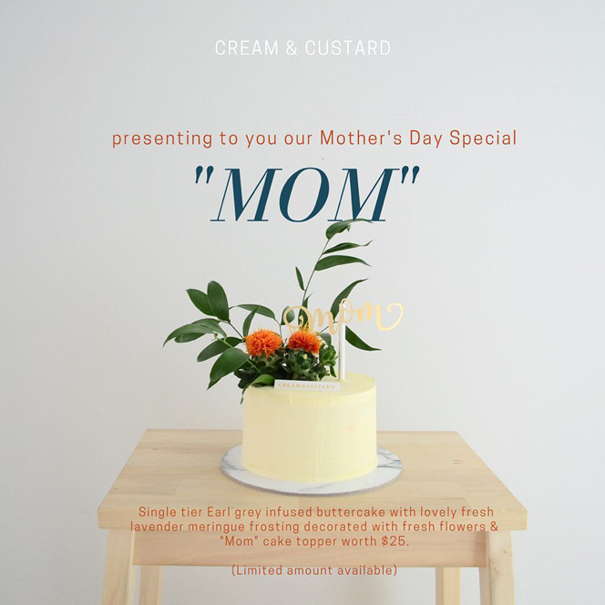 Why not skip the typical cake and bouquet of flowers this year and go for a beautiful union of both of them! Cream and Custard are having a mother’s day promotion that offers their signature earl grey lavender cake decorated with lovely fresh flowers and a “MOM” cake topper worth $25. It’s only available for collection or delivery on the 10th-12th of May 2019.