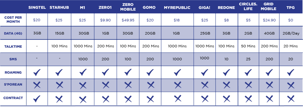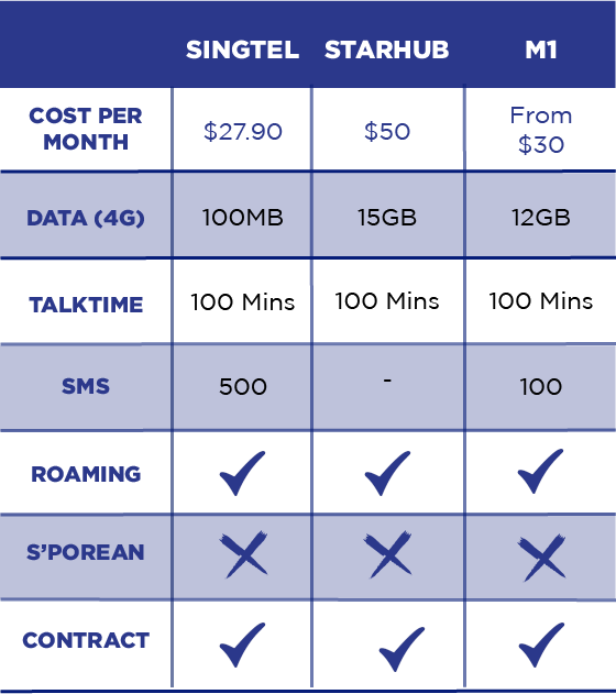 Firstly, here’s a table of Singapore’s Mobile Telecommunication companies with their prices, data usage, and contacts.