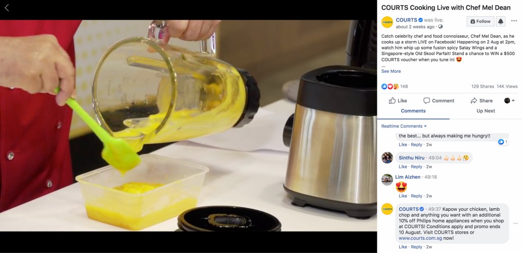 One example would be a cooking show done by COURTS whereby the featured products such as a blender and air fryer to cook a meal by a local chef. This recipe was shared during the live stream and those who like to cook would definitely stay throughout to see how the food would turn out.